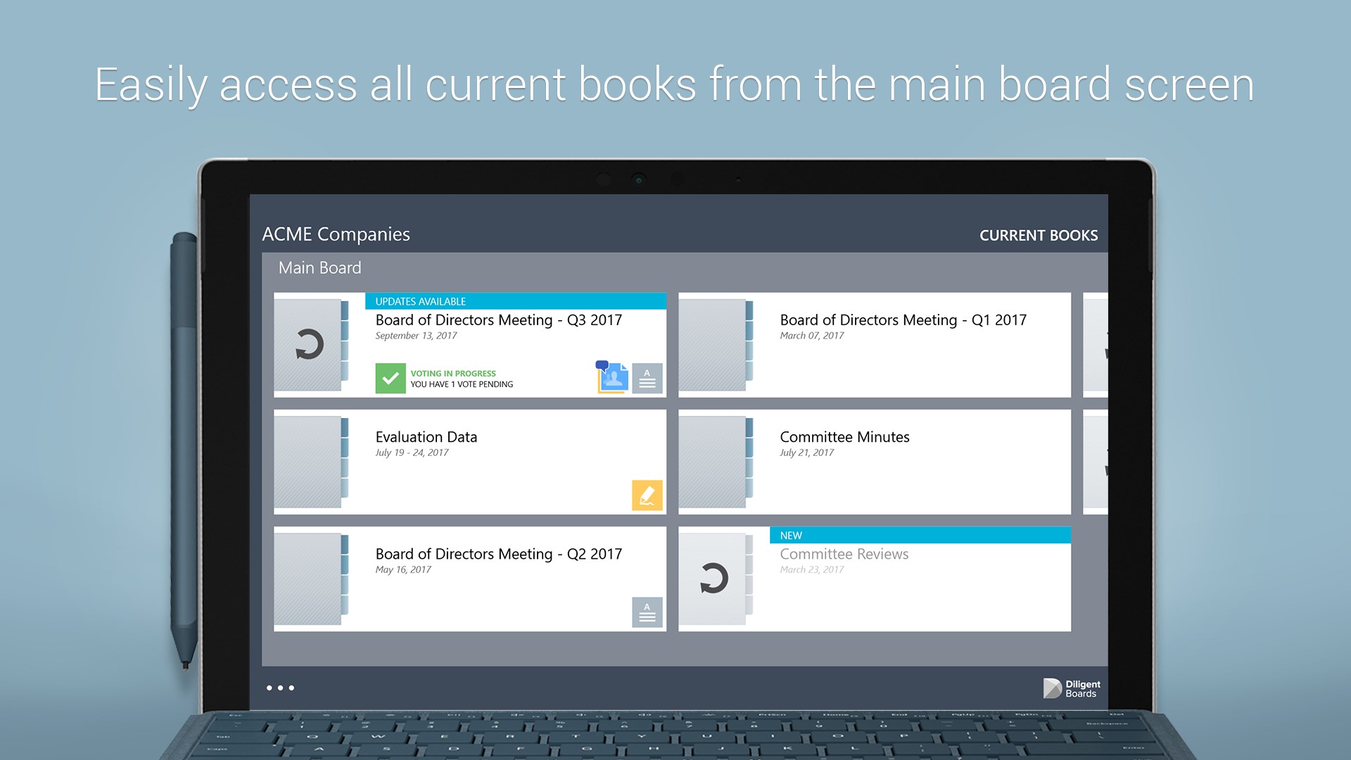 The most intuitive and secure way to improve communications and decision-making Diligent Boards gives you immediate access to board books and meeting materials.